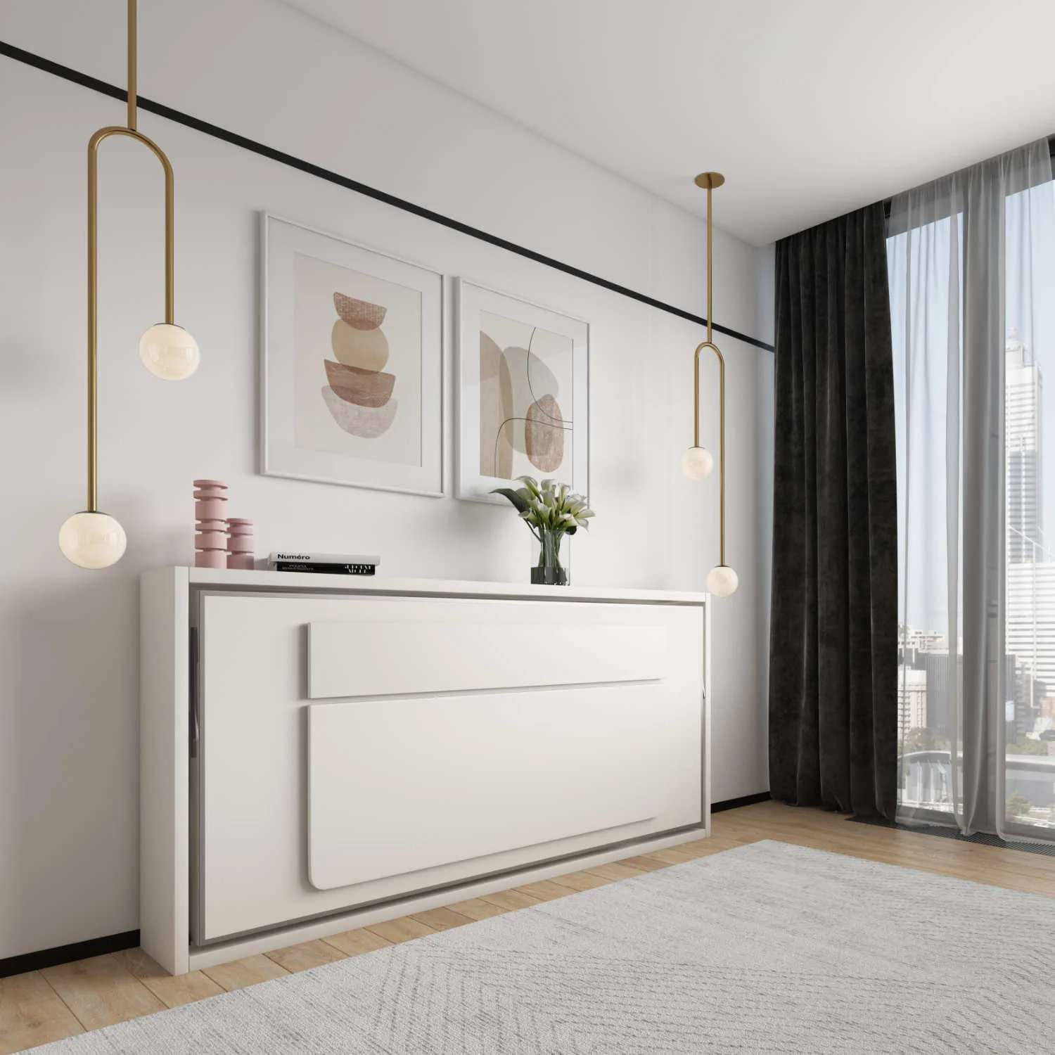 The thinnest horizontal twin sized murphy bed in the world with a fold away desk. This is a space saving master piece in design. Made in Italy and it includes a mattress. The extra compact design takes up minimal depth in your room while still giving you a comfortable sleep. The fold away desks gives you a wide area and a 21.25″ depth which is comfortable for working on. It folds away and locks tight so you can close the bed without worrying that it will open. The bed also locks in place so it will not open if you push down on the desk. Built to order in Italy and shipped direct to your home in North America. See the panel choice options below.