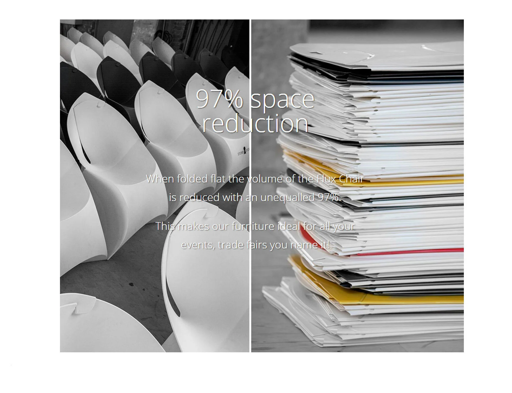 European designers at Flux have made a ridiculously compact folding chair so you can maximize your space. The Flux Envelope chair stores away at only 3/5ths of an inch thin but can support 353 lbs as a seat for your guests. An amazing product for occasional seating and just as useful for trade shows and events that requires seating without huge storage fees. These chairs come in 4 packs. For bulk orders over 10+ inquire for a shipping discount. Flux chairs are perfect for trade shows & events as they compact down to take up very little space.