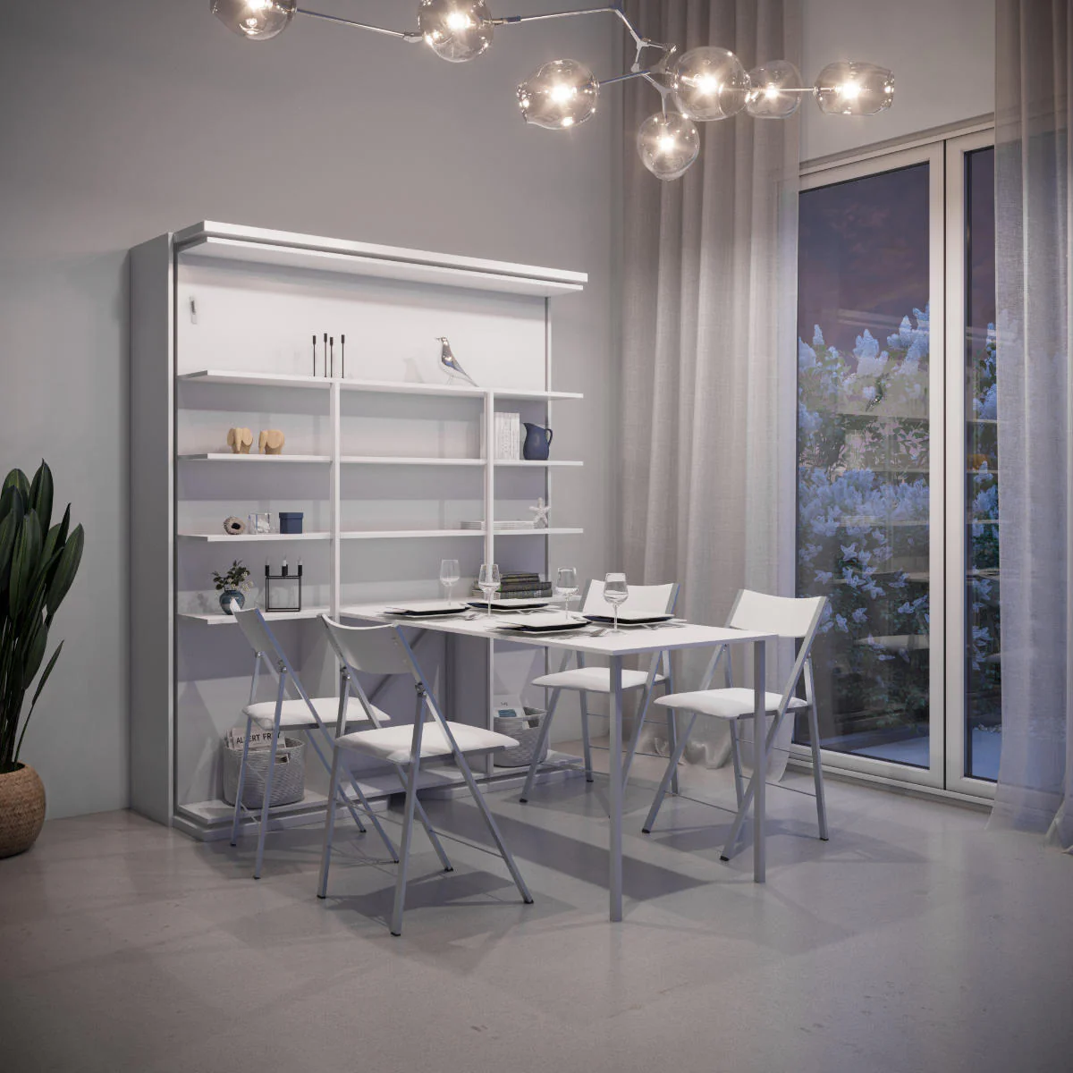 The shelves can blend into a room with a larger library, serve as ornamental shelving space or be a bookshelf on its own. With a few simple twists and turns your books and possessions are hidden away and you can lower your bed for a good night’s sleep. We include a premium memory foam Italian mattress and the sliding table. The table is a huge benefit, allowing you to have a dining table in a home where space does not permit, or just to have a hide away table and convertible bed which free up a big area during the day making any space more livable. This table does not have to be attached to the unit or can even be removed at a later date. You can use it on any wall in your home. For custom orders you can choose 2 tone finishes or all 1 tone: [table + shelving color] & [outside box + back panels]. We can also build custom cabinetry around the system to fit your space perfectly. Premium Memory foam mattress is included with purchase
