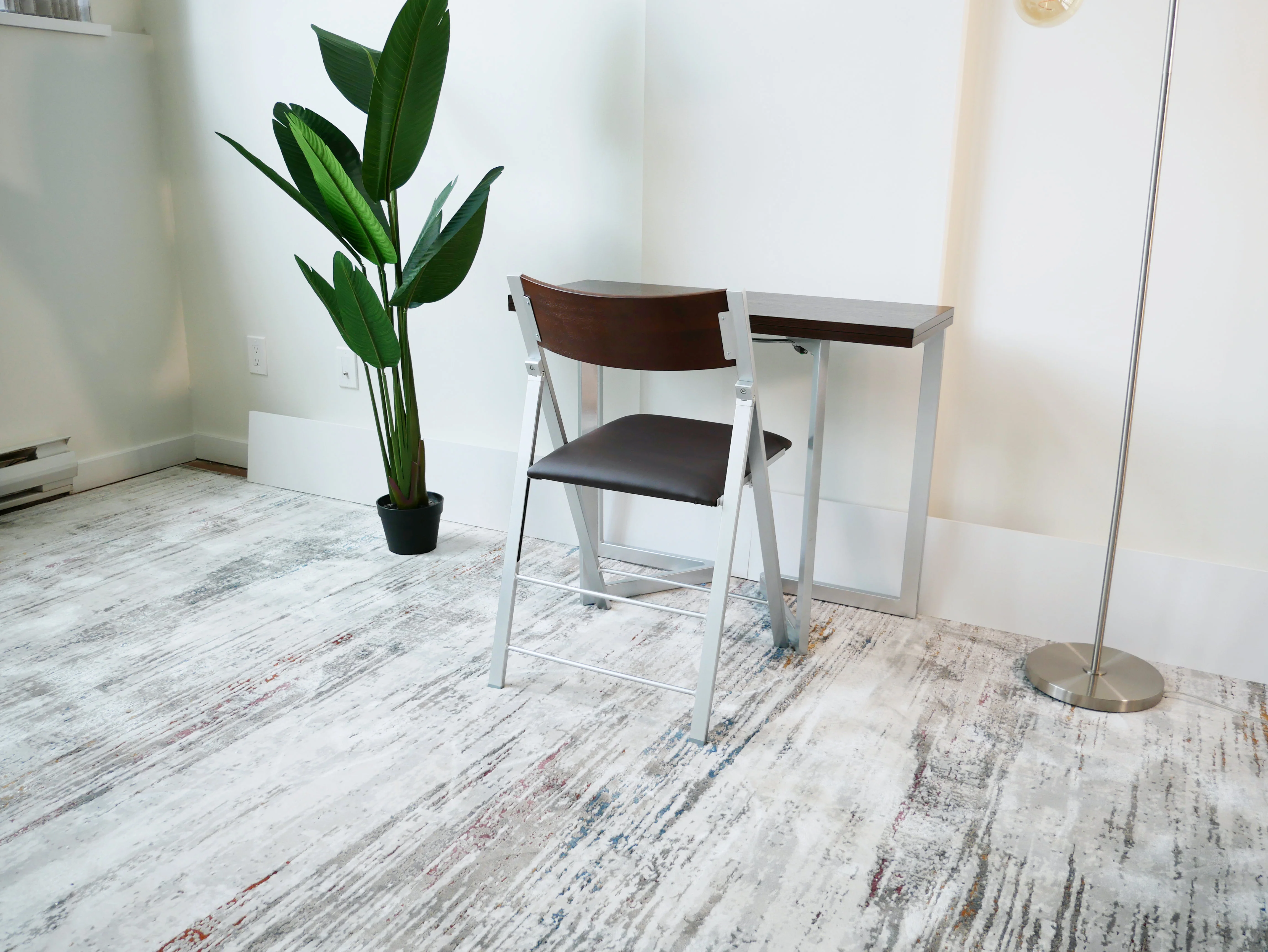 In Mini desk form it occupies a minimal footprint with the option to double its size when necessary. It can also stand alone as a charming side piece/console with decorative art adorning it. The designer angles make this piece particularly sharp in its appeal as the legs and stand form a wide “V”- this is not your average boxy looking side piece! The mini flip-up console table-top neatly packs in and away for streamlined use up against a wall or sofa, or can double when opened as a working station or dining table. It only requires a few movements for the table expands to double its size, all in a flash with easy swivel legs and flip table top. From work-mode, the transformation to dining-mode has never been so easy to convert, nor looked so classy. For pure beauty and function this Mini Flip is the way to go. The Mini Flip table has lovely finishes including wood tones and glossy paints, with appealing metal legs. If you have more real estate to play with in your space, check out the original Flip Console or the even bigger transforming Junior to Giant Table.
