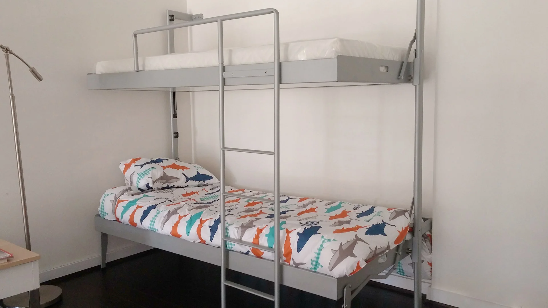 The upper bunk can be tilted downward so you can easily make the bed, change the sheets or rotate the mattress. Both Murphy bunk beds can easily support adult weights. Available in your choice of panel finish. Our compact wall beds are made with the highest quality in mind. Produced per order in Italy and delivered to your home in ~16-20 weeks after placing your order. If you don’t have time for a custom order view our in stock Hover Folding Bunk Bed system. or our collection of bunk beds here.