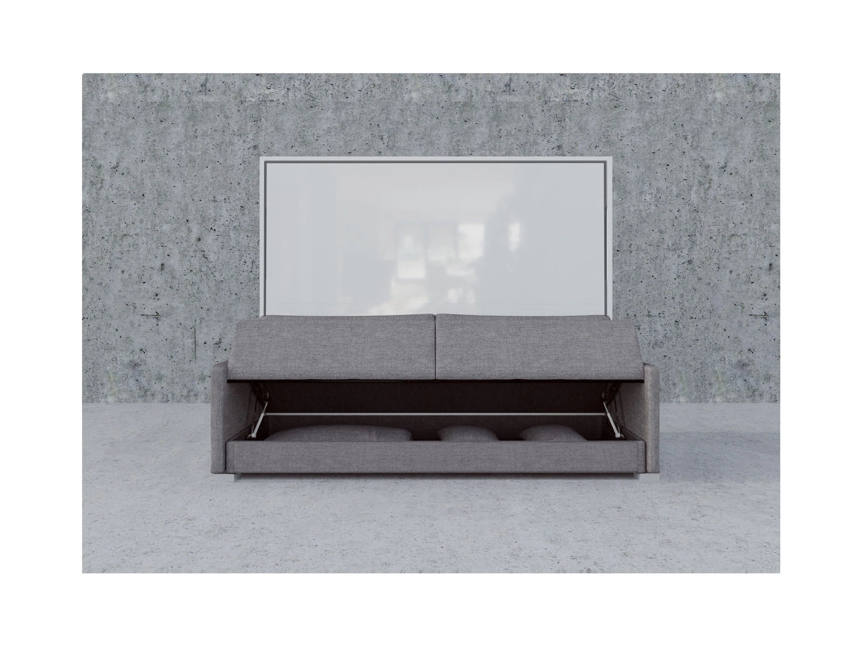 Sofa includes a storage compartment, compact arms, and the sofa fabric is removable and replaceable. You can also order the stock grey for a quick delivery and have a completely custom cover delivered at a later date in your color choice. View the fabric replacement option here. Wall Bed has quad piston system and euro slats in supported by a metal bed-frame.