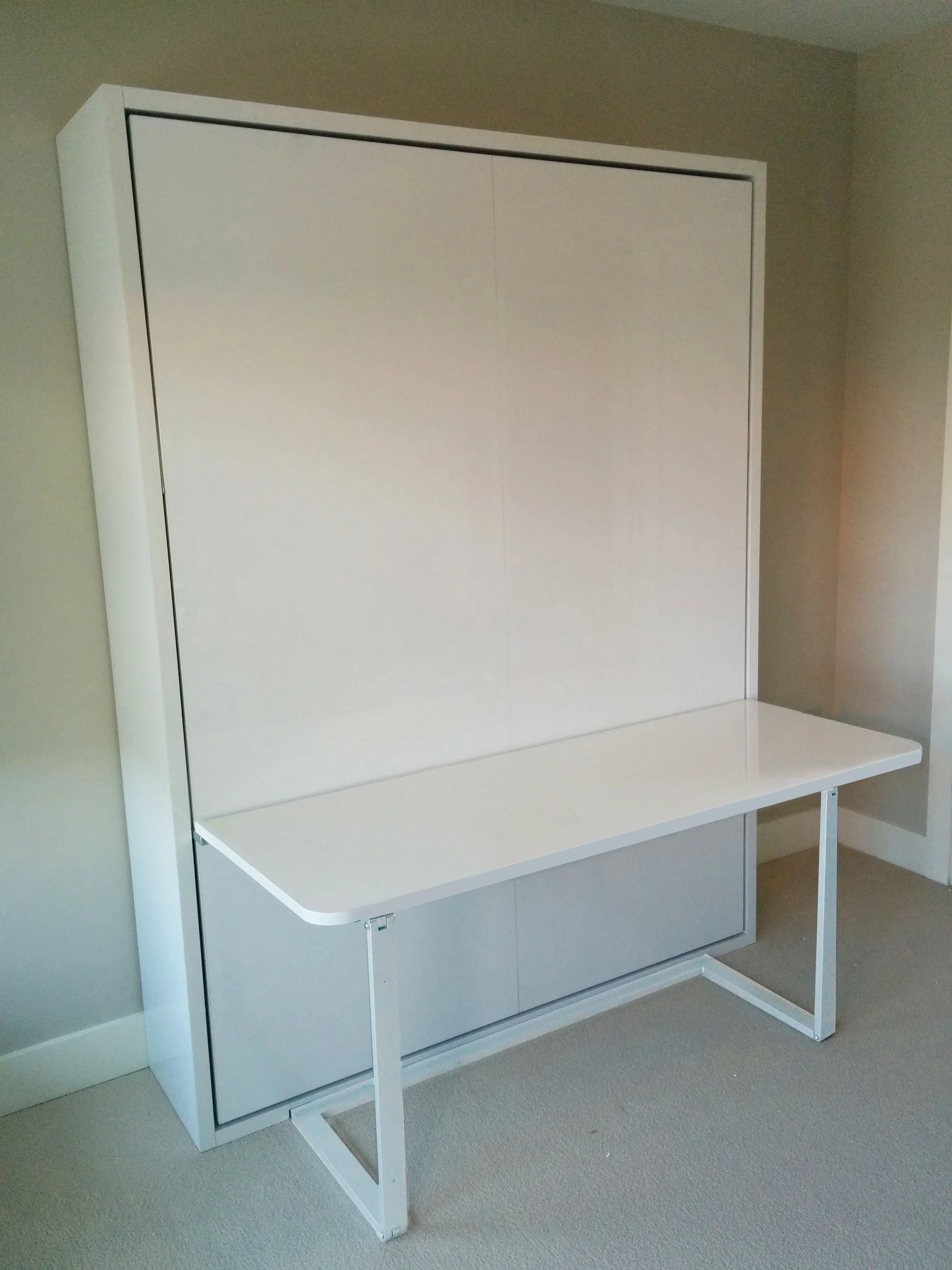 The modern wall bed is finished in glossy white on the outside. The inside back panel on this bed is in flat white, please note this. The desk is square with rounded corners and also replaceable. If you wanted to change the look over time you can add on your own surface very easily.