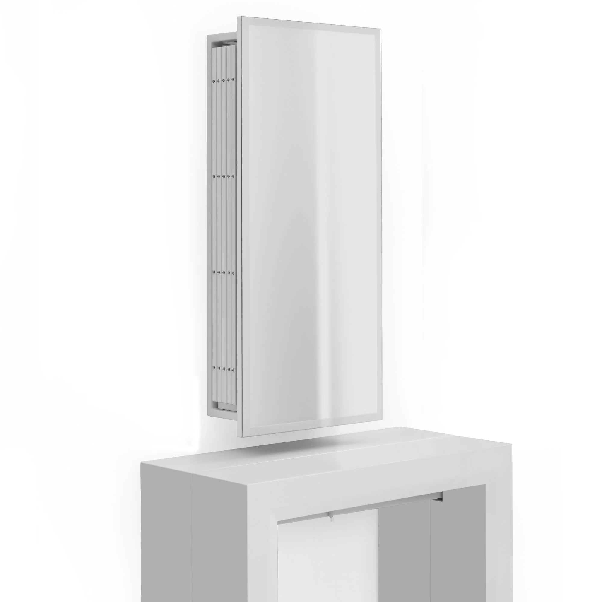 The Occulto Mirror brilliantly stores 5x Junior Giant Table extensions leaves behind the mirror. Place the mirror on a wall above your extending console to dining table and pull out an extension from the storage compartment when you want to expand your dining table. It can also store other items of your choosing or you can fit 2x Nano folding chairs inside and 1 extensions for a rapid 2 person expansion.