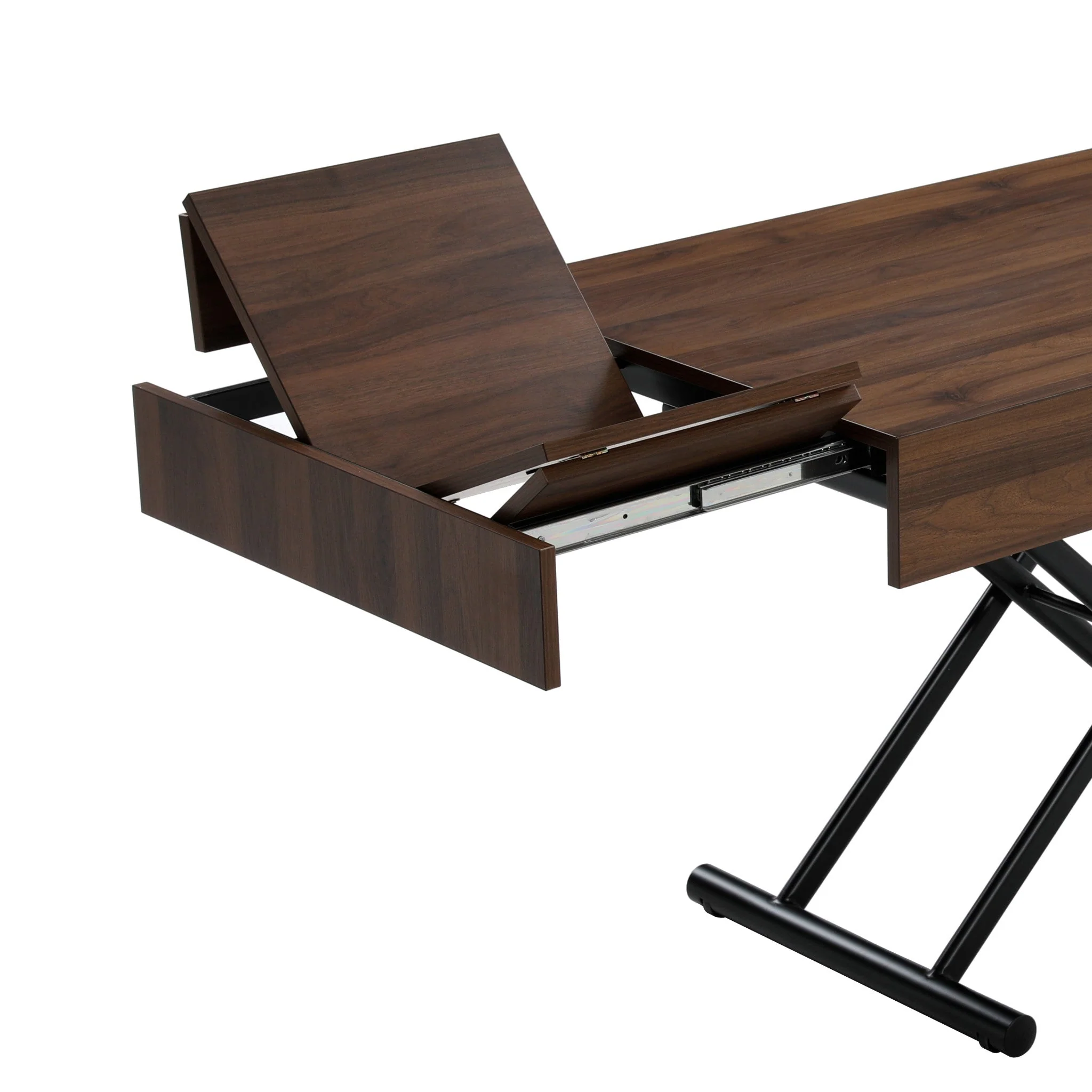 Resourceful furniture is important when you have limited space. This space-saving coffee table becomes a dinner table by extending the ends outwards. Height adjustable anywhere from 11 inches to 30 inches. Walnut top and dark grey legs.