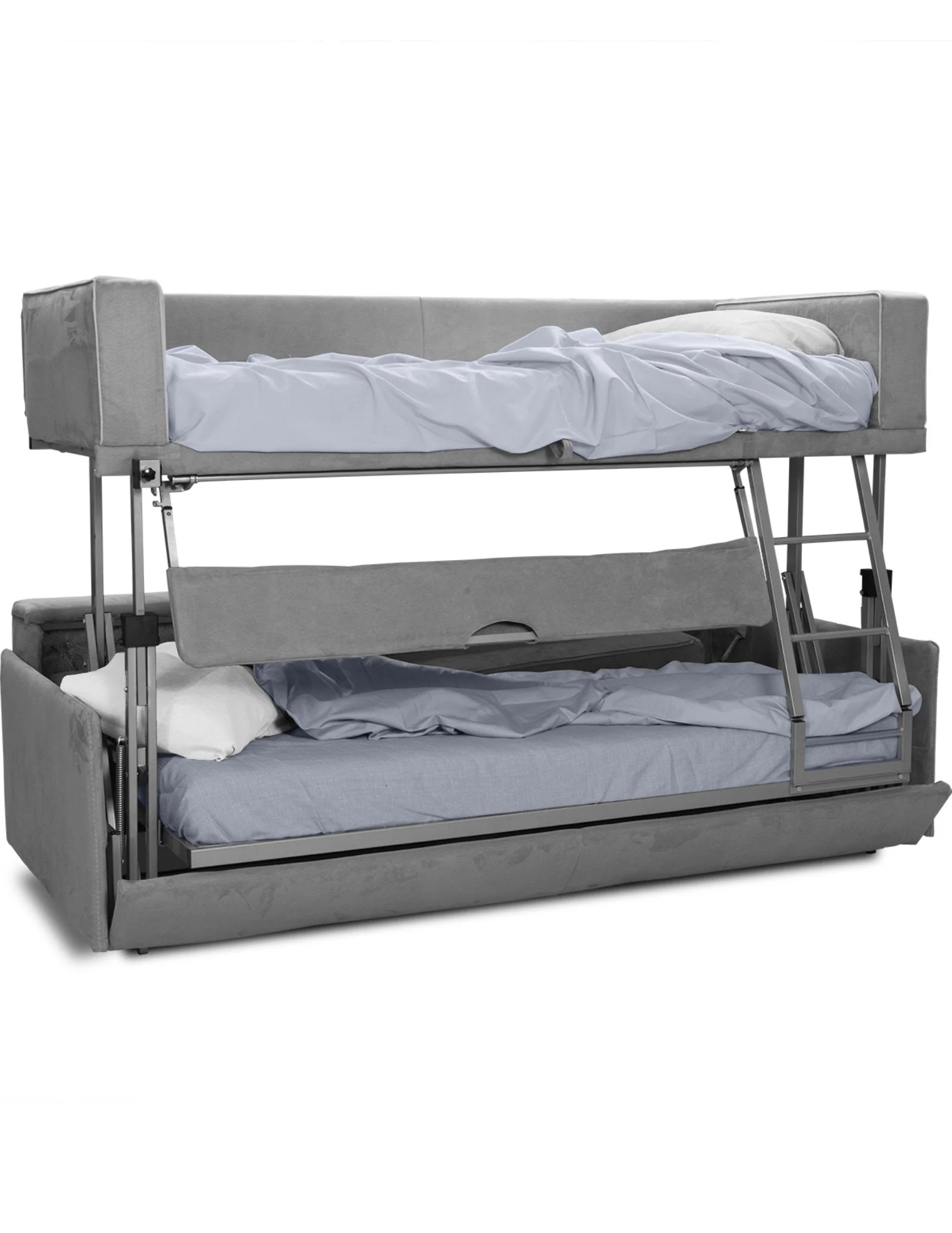 An easy to use bunk bed couch transformer, the Dormire sleeps 2 adults after converting into a bunk bed. The upper bunk height is 51.2 inches tall and the built-in ladder doubles as a support. The system includes a key with a lock for added security.