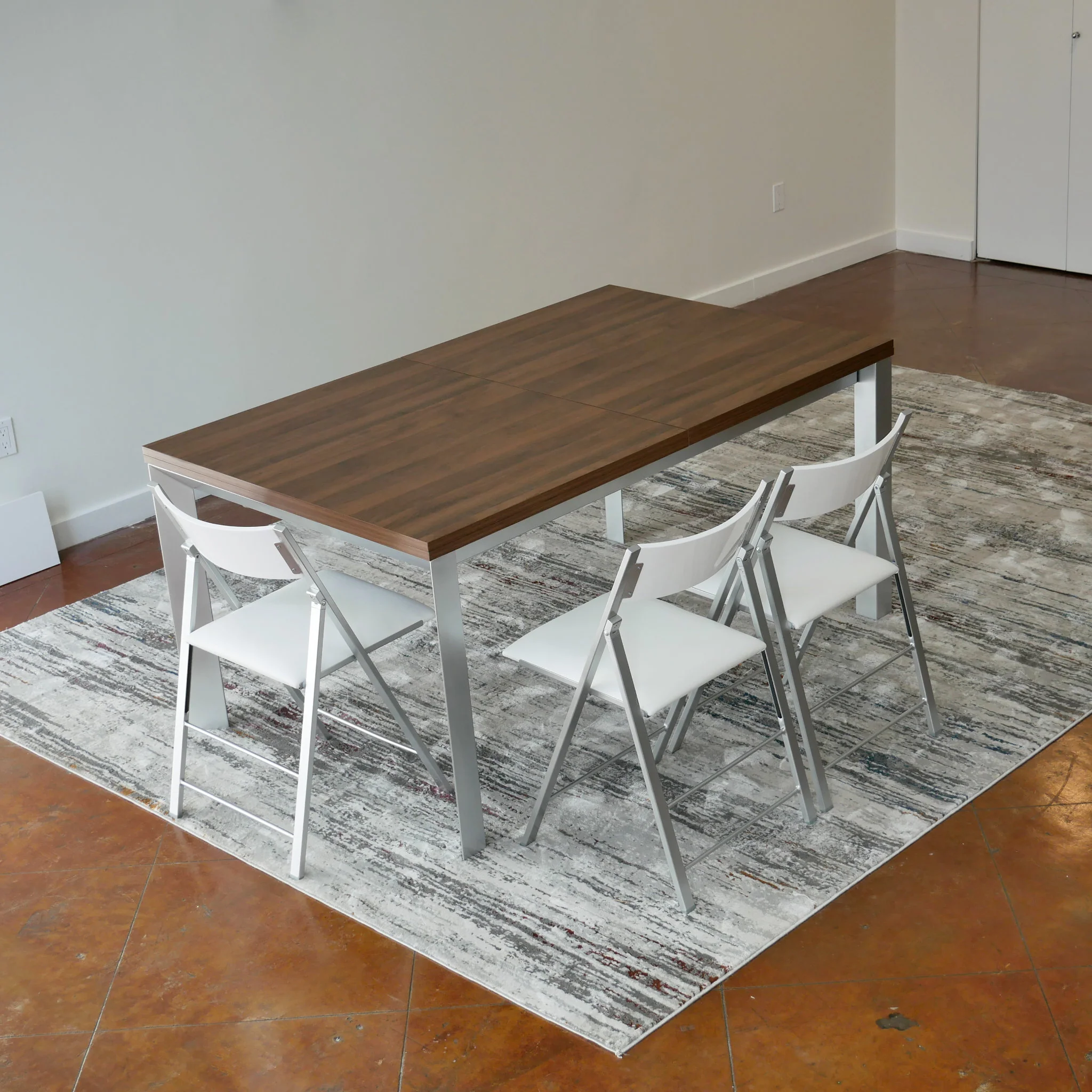 The smallest table setting size of 160cm (63 inches/5ft) in length increases to the next size of 240cm (94 inches/7ft) and then an even further expansion out to 320cm (125 inches/10ft). It shows beautifully in the trendy new Grey wood look with silver legs or the crowd pleasing Walnut finish with silver legs. The notable point about the Mega Abode is not only that it increases the size of your abode-living quarters, but that it is incredibly multi functional in size without being complicated. Whether a large or small home, open style concept living has become the new style choice and functional way of living. Our homes and office spaces need to adapt and convert to accommodate functions, including times where your office may need to make use of a larger conference table, or turn the biggest table back into a smaller table to make use of the open area. When it comes to flexibility and overall no fuss, no frills – the Mega Abode is definitely the preferred choice. If you are looking a more compact option that still has massive seating, check out the Tiny Titan or the Junior Giant.